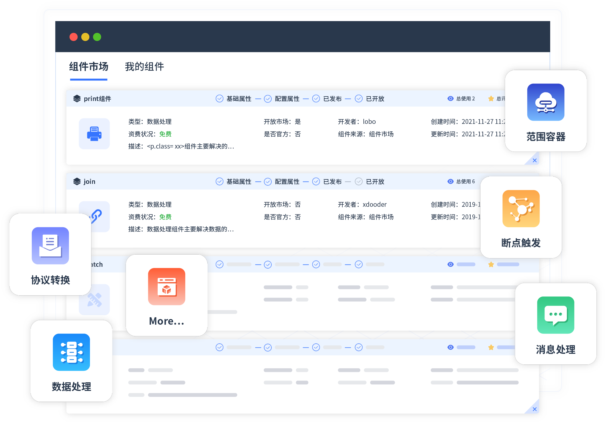 针对集成场景,GOPAY钱包 提供组件市场,例如协议转换、消息处理、文件操作等。除平台提供的组件外,客户可以自定义所需组件。